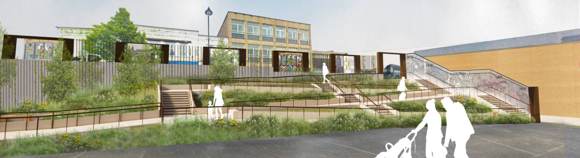 The public space plans include landscaped paths with accessible ramps, steps and seating, and beautiful greenery to make the town centre feel more vibrant and enjoyable.