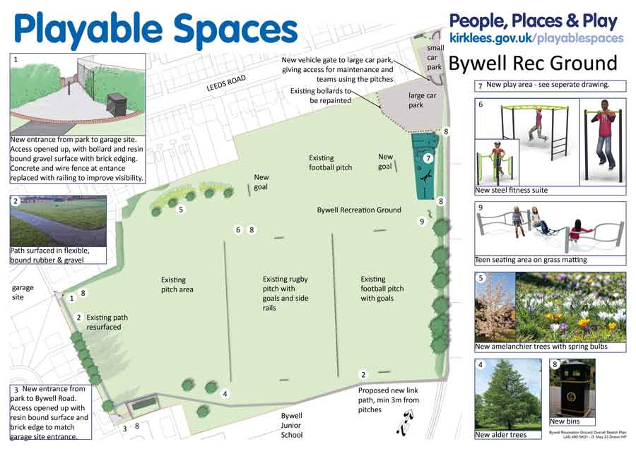 These proposals include opening up the pedestrian access to and from the recreation ground from Leeds Road to make it more accessible. As part of this we would install a new bollard to stop unwanted vehicles, such as motorbikes, a new resin bound surface with brick edging, replacing the concrete and wire fence with a railing to allow for increased visibility onto the site and a new bin. We would then mirror the look of this entrance at the entrance to Bywell Road (next to the school), and resurface the path that joins the two entrances with a flexible bound rubber and gravel material. We will be planting new Alder trees and spring flowering bulbs. There is also a new design for the Play area, this includes enlarging the play area and adding in new equipment on to a blue ecomulch safety surfacing please look at the close up design of the play area. In addition to this there will be a new vehicle gate to the larger car park from Leeds Road for maintenance and sports teams, the wall in the car park will be treated to deter people being able to sit and congregate. Finally the bollards along the edge of the car park will be repainted pink to soften the space.