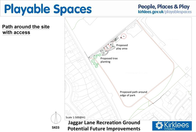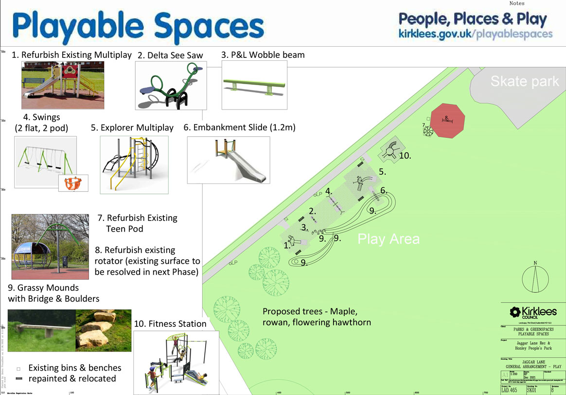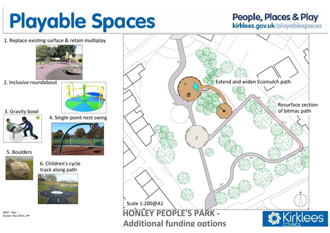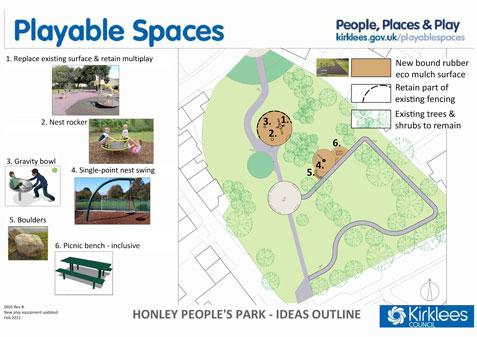 A draft plan has been put together for improvements at both parks, aiming to make play provision in Honley as a whole more appealing and accessible to all age groups by using a variety of play equipment types and natural play features. Improvements for the two parks have been designed to be complimentary owing to their close proximity.