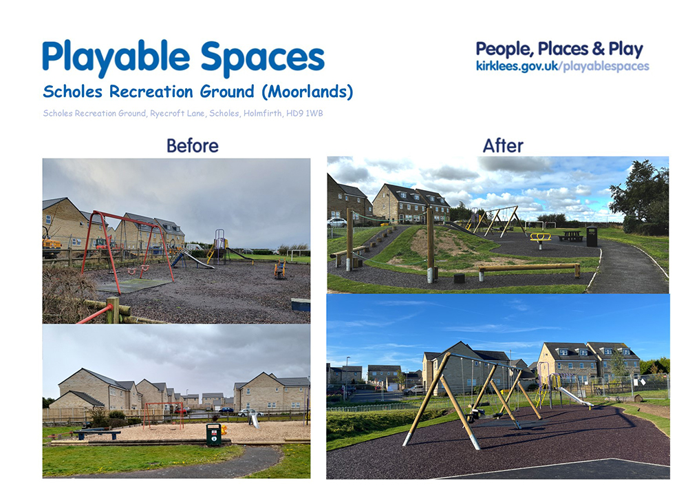Scholes Recreation Ground (Moorlands) is located in the Holme Valley South ward of Kirklees. Together with Ward Councillors, we selected this site for redevelopment as it was one of the oldest play areas in Holme Valley North and needed updating.