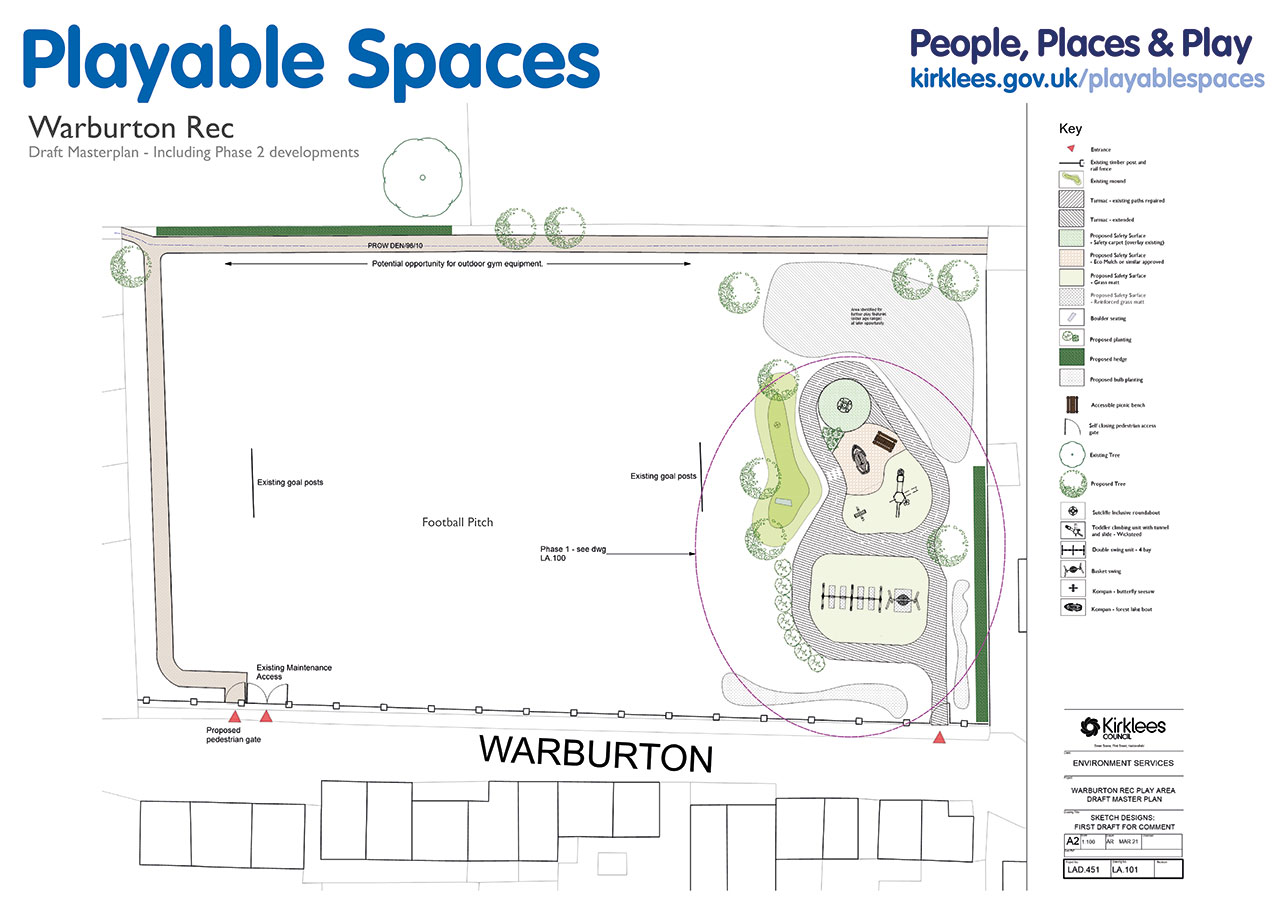 Warburton Recreation Ground can be found on Warburton in Emley, and is in the Denby Dale Ward of Kirklees. This is the main play area for Emley village and has been prioritised for updating due to its age.