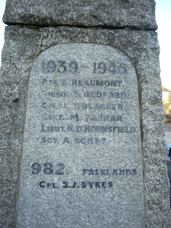 The periods commemorated are the 1914-1919 and 1939-1945 world wars, and the Falklands War in 1982.