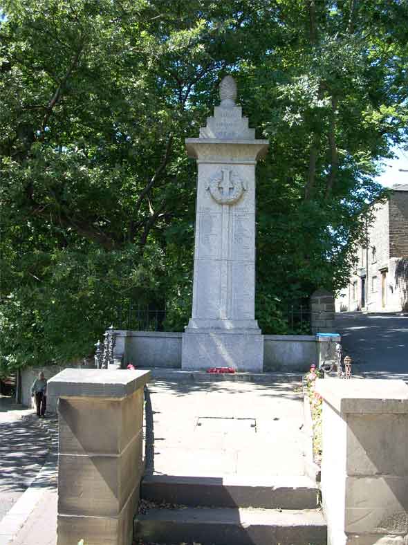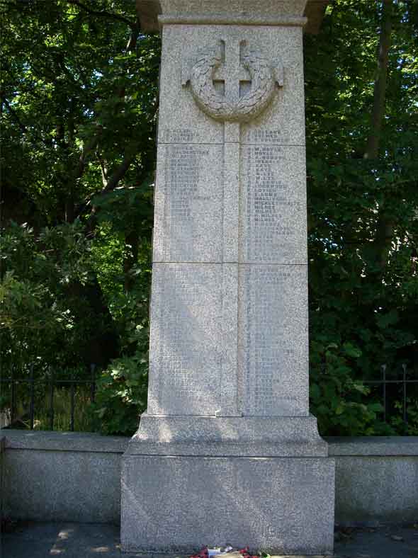 This round granite obelisk, with a wreath on top and names inscribed on the front and base, was designed by architect Ivor Beaumont and built by T. Judd & Co, 115 Holloway Road, London.