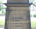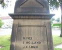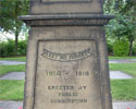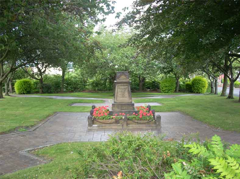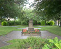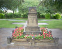 A stone-built monument standing approximately 6 feet high, surrounded by grassed areas with shrubs and flower beds.