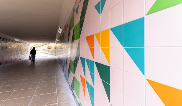 If you use the underpass below Rishworth Road, you'll walk through the colourful tiled artwork called 'Tessella' by Saba Rifat.