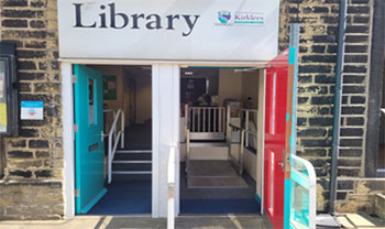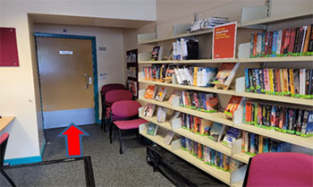 I will enter the library through the left-hand door. There are three steps to walk up.