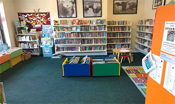 When I go left into the library I will see the help desk, children's area and fiction books.