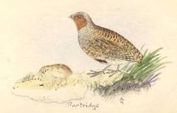 Our grey partridge is an illustration by Seth Lister Mosley (1847-1929), Tolson Museum's first curator. Mosley was a naturalist, taxidermist, and painter, and had a fascination with British flora and fauna. Grey partridges are found in grasslands in the UK and are ground birds (so unlikely to be found in any pear trees) with distinctive red faces and patches on their bellies.