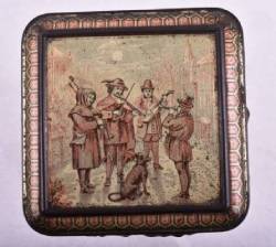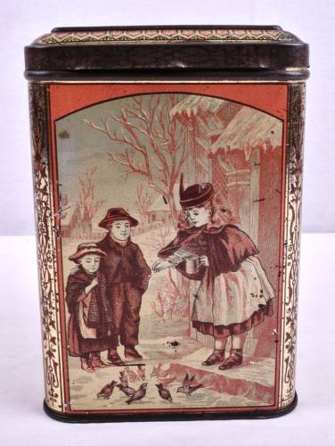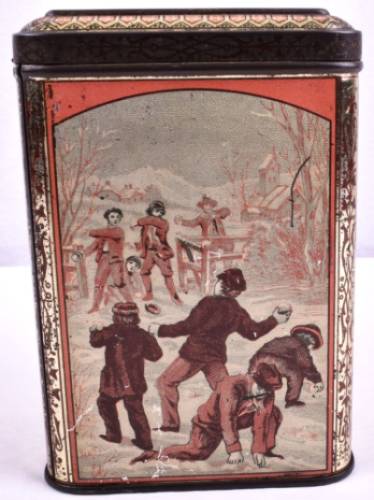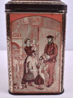 Each year Hartley & Palmers would release their coveted Christmas catalogue showcasing their special designs. Our tin depicts a festive scene on each side of the box. A snowball fight, a father returning home with a gift, a girl feeding the birds, and a family decorating a tree.