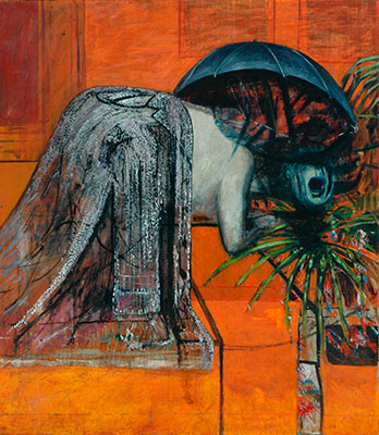 Figure Study II is one of a series of paintings from the 1940s that feature a range of visual elements-coats, umbrellas, plants and flowers, and in this case a screaming figure-set in ambiguous interiors with an orange background. They represent the first group of works that Bacon was confident about exhibiting, having destroyed a number of earlier works from the 1930s. Due to the notoriety of 'Three Studies for Figures at the Base of a Crucifixion', 1944, acquired by Tate in 1953, many of these works were assumed to have religious subjects, something which the vehemently atheist artist later denied. The generally accepted apocalyptic nature of the subjects can be seen as a response to the impact of the recent world war and contemporary feelings of despair and isolation.